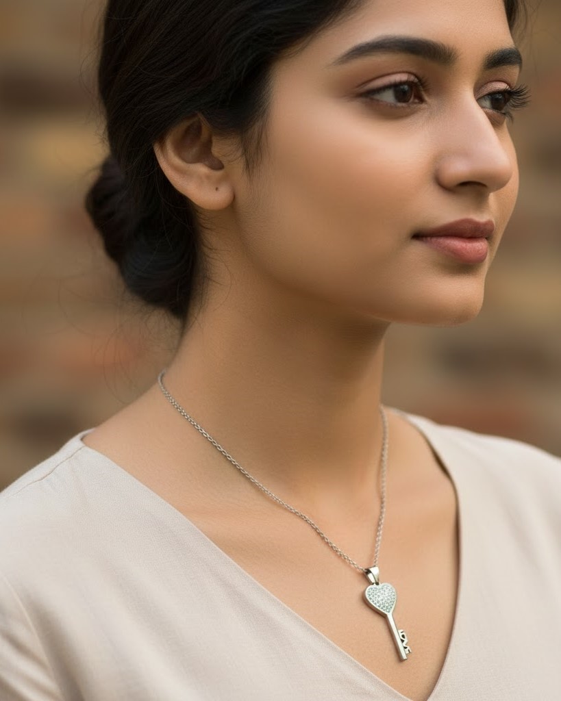 Heart Key Pendant Necklace with Crystals – Silver Finish (RCPN006)