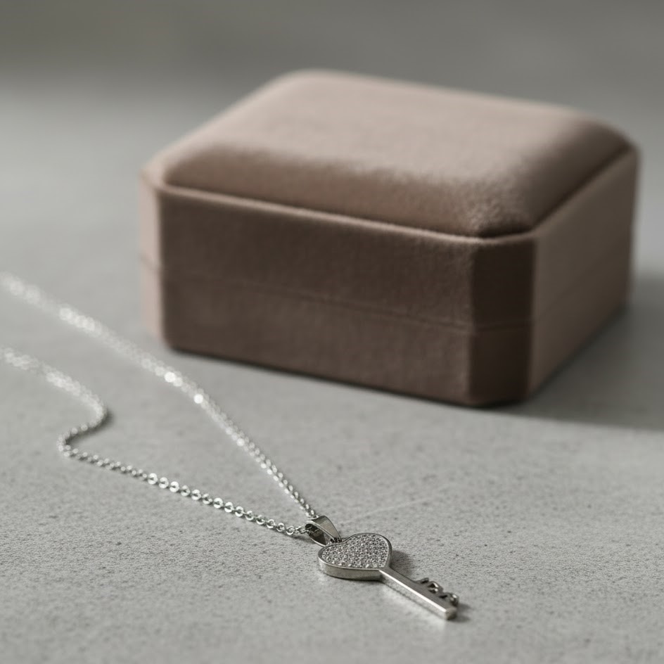 - Unique heart-shaped key pendant with sparkling pave crystals